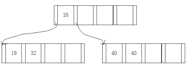 d=2이므로 (2*2/2+ 1)번째 key값 35를 center record라고 하자. 이를 기준으로 왼쪽 19와, 32는 curr노드로, 40과 48은 새로 할당되는 new_node로 삽입된다.