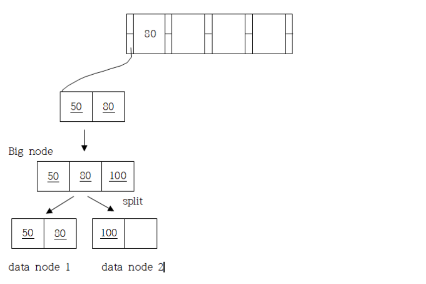 - → 삽입할 record와 데이터 노드의 모든 record를 big node에 넣고 두 부분으로 split